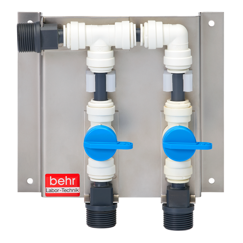 Das Verteilerstück mit 2 Auslaufhähnen dient der parallelen Versorgung von zwei Entnahmestellen mit vollentsalztem Wasser (VE-Wasser) in Kombination mit druckfesten behropur Ionenaustauschern. Es ermöglicht eine effiziente und bedarfsgerechte Wasserverteilung innerhalb von Labor- und Industrieanwendungen.
